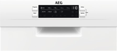 Lydsvag opvaskemaskine fra AEG med udskudt startfunktion, Autosluk og plads til 10 kuverter. Læs hele beskrivelsen