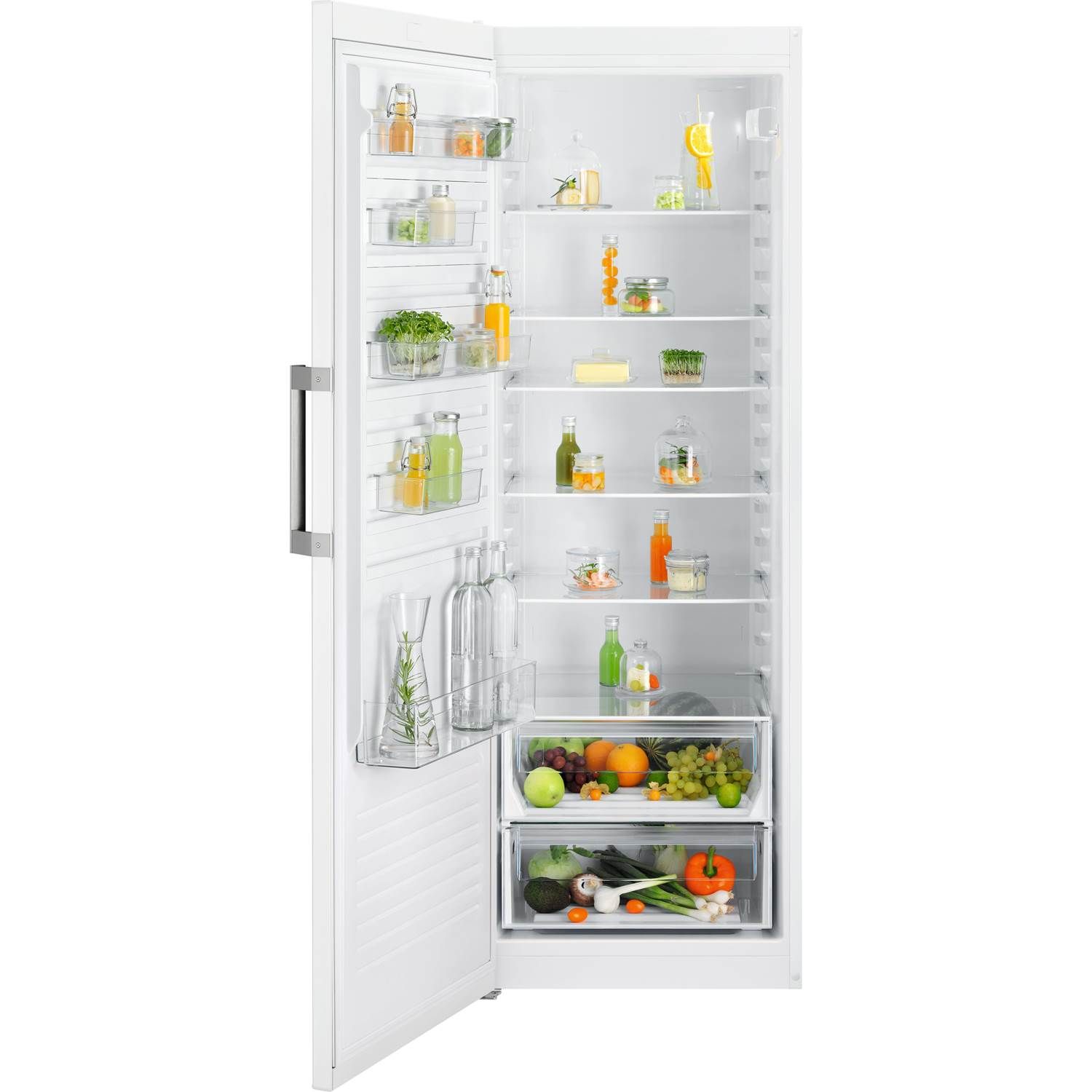 Køleskabet har et gennemtænkt OptiSpace-design, der giver masser af plads både på og mellem hylderne. Hvis du har brug for endnu mere plads, kan skufferne nemt fjernes, så du kan tilpasse opbevaringen til dine behov.