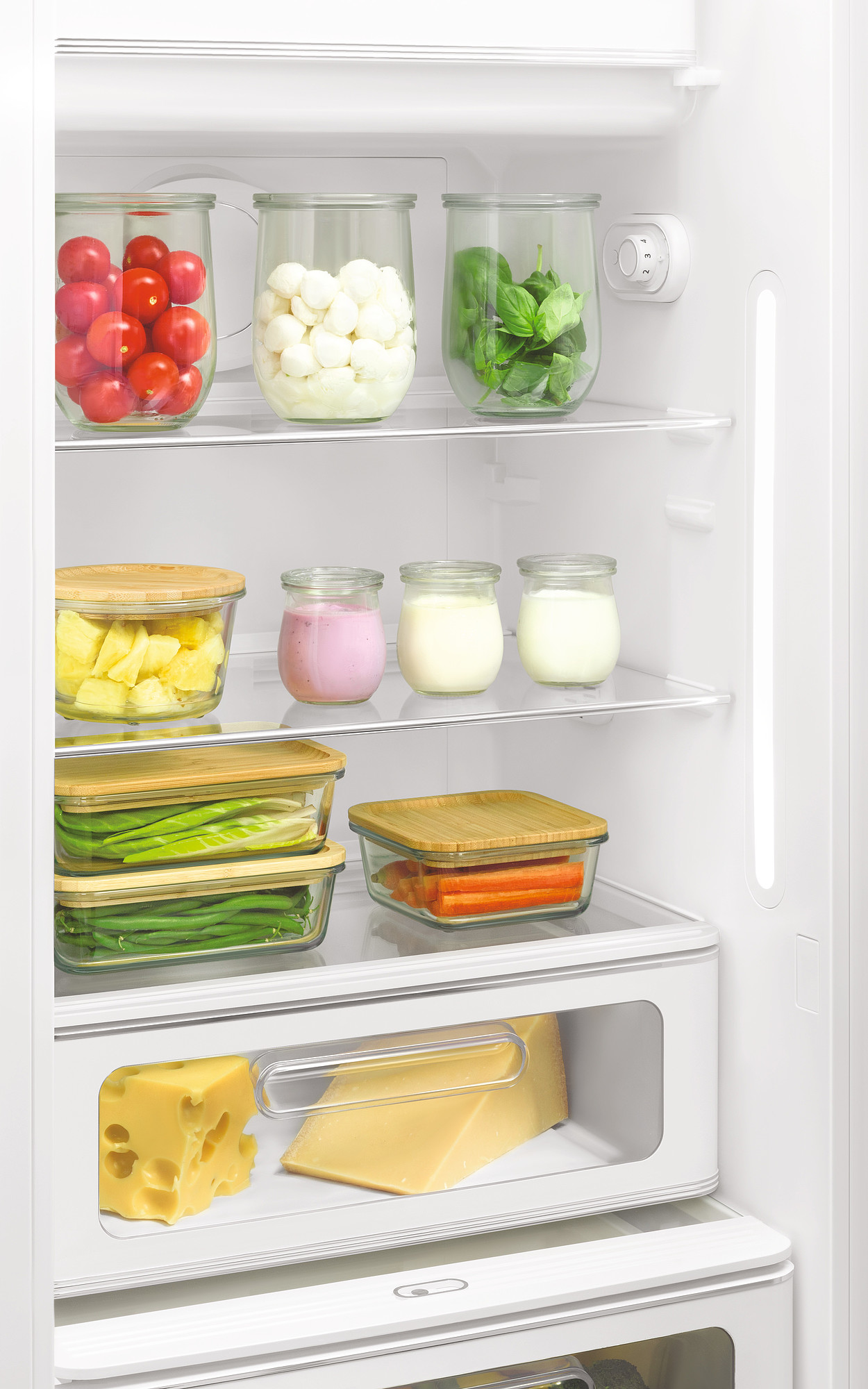 Køleskab fra Smeg i pastelgrøn med fryseboks, grøntsagsskuffe og LED belysning. Læs hele beskrivelsen