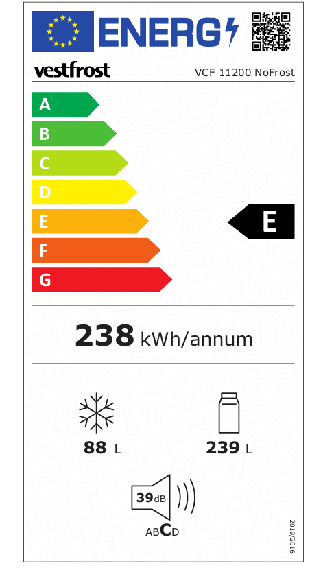 Fritstående køle-/fryseskab med Nofrost. Kølekapacitet på 239 L og frysekapacitet på 88 L. Læs hele beskrivelsen